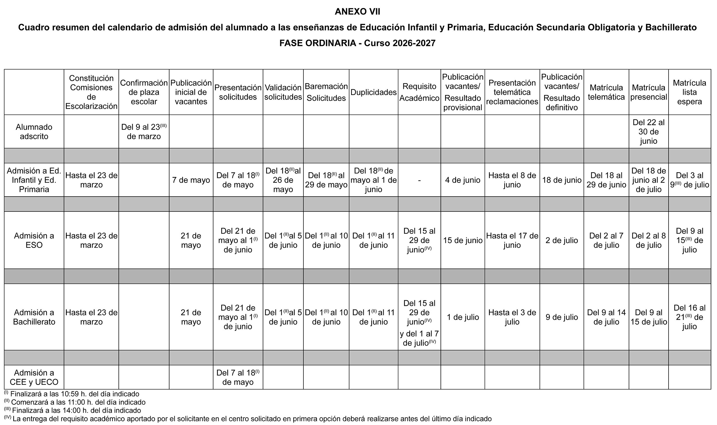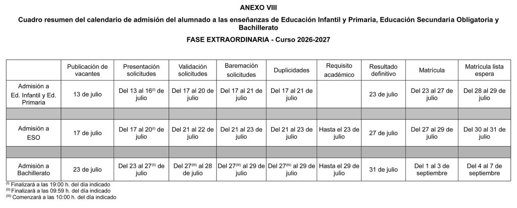 RESOLUCIÓN de 25 de febrero de 2026, de la Dirección General de Centros Docentes, por la que se establece el calendario y se dictan instrucciones respecto al procedimiento de admisión del alumnado en los centros docentes sostenidos con fondos públicos de la Comunitat Valenciana que imparten enseñanzas de Educación Infantil, Educación Primaria, Educación Secundaria Obligatoria y Bachillerato, y en los centros de Educación Especial, para el curso 2026-2027